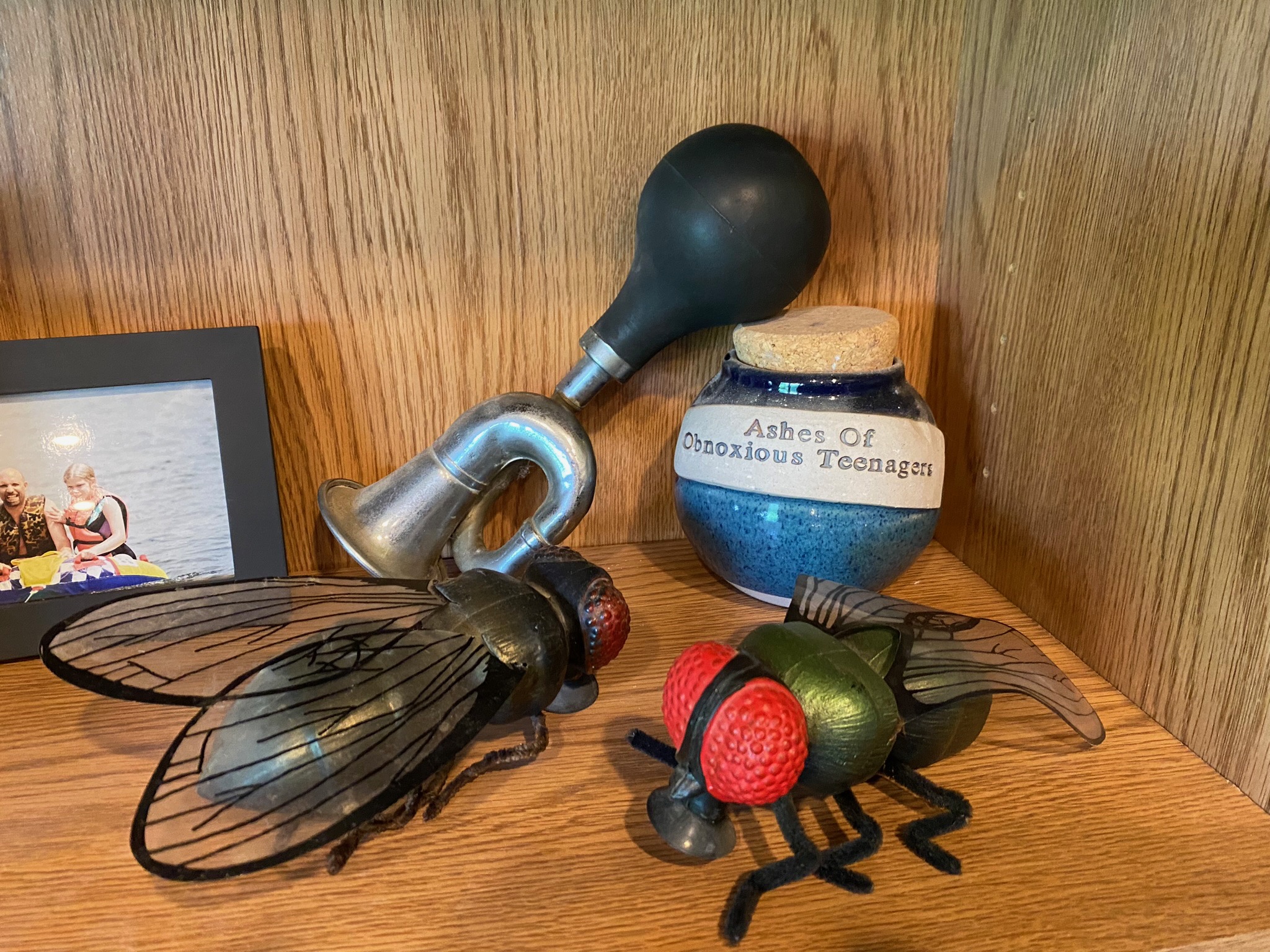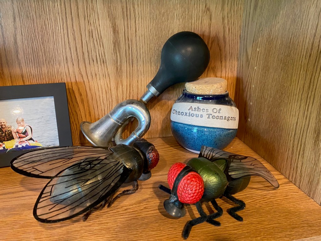 I have a wall of bookshelves filled with stranger things that have no value and mean nothing to anyone but me: one large fly from my eight-year-old birthday with a suction cup that stuck to my bedroom mirror for years. Then as a teenager my sister gifted me with a second giant fly that stuck to the lake cottage kitchen mirror for almost two decades. I have a half-century-old, six ounce red cup shaped like a cowboy boot from Mom and Dad: my sister had a blue one, and my brother had a yellow one. I lived the last semester of senior year in high school on the 5th Floor of the downtown YMCA, and when the building got demolished, I swiped a brick. More recently, the shelves house a Duke Cannon Big Brick of Soap that “smells like accomplishment” for Real Men that my nephew gave me a few years ago.