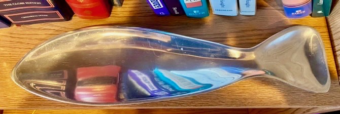 In keeping with the wedding theme, I have a never-been-used silver fish dish, a chum-ugly piece of modern art that sits on a shelf in my office because Deb has threatened if ever seen swimming again in the kitchen cabinets, she will catch and release it to the trash. We received this silver serving tray as a wedding gift from a friend whom I met at five-years-old and who lived across the street from 4716 Indiana Ave. We went to Kindergarten together at Harrison Hill Elementary. He graduated from South Side High School and I went to Bishop Luers, but fifty-six years later, we still go out to eat for our October birthdays. I’m not getting rid of this minimalist fish dish that John Hogan gave us.