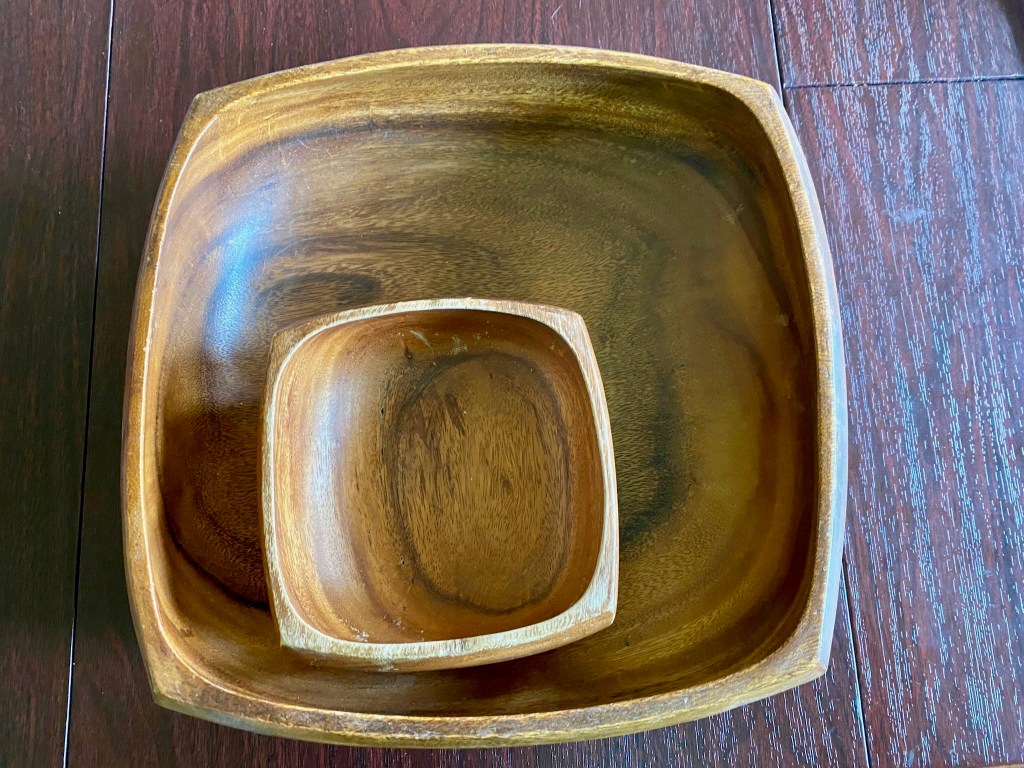 No one will have the slightest clue as to why a big wooden salad bowl sits on top of a bookshelf in my office. The oversized basin came with six or eight wooden salad bowls that Deb pitched decades ago. I rescued the serving bowl because the whole set came as a wedding gift from two high school friends, Chris Nix and Dick Kelly. I’m not getting rid of the surviving bowl. The wooden tub came from two great friends and neither would remember that they gave it to us, but the gift connects me to my high school years, and I will not part with it.