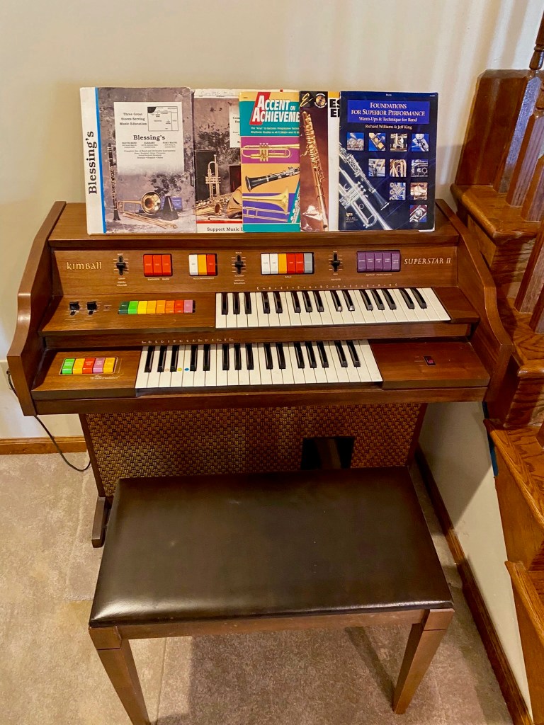 Forty plus years later, I concede that after the initial inspiration for concerts and songfests around the organ receded, or more accurately never transpired, its minimal usage did not transcend into anything grand. Cora worked out a deal with Kimball to house her 4th and 5th grade flute sheet music, and her middle school music books still repose on its music stand. On rare whims, someone might hit the tango or salsa buttons and toggle up the tempo, but through the decades, the bench has received more attention for extra seating and cup-holding than the organ has for hoedowns and hootenannies.